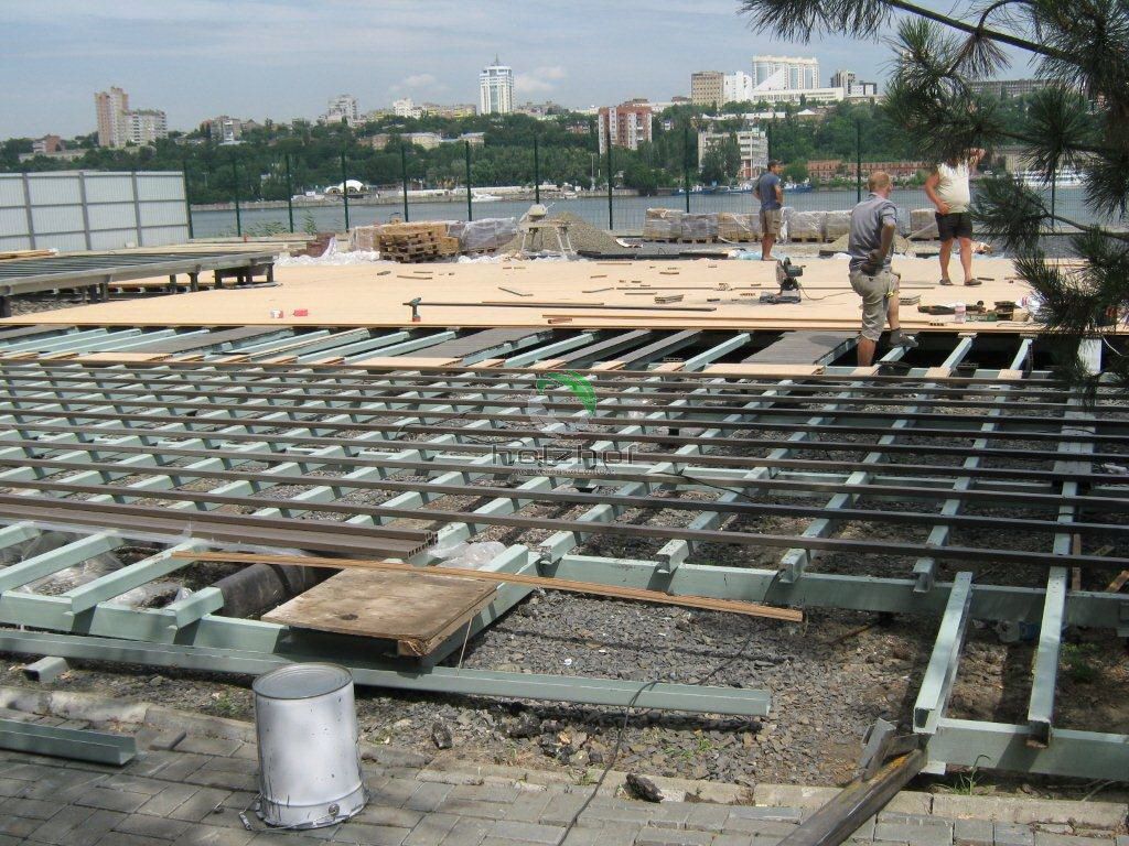 Выполнены работы по монтажу декинга из ДПК в г. Ростове-на-Дону. Общий объем работ составил более 1500 кв.м. Все работы выполнены бригадой наших монтажников. Интересным моментом в данном проекте было изготовление нескольких видов оснований для подконструкции. Тут применялись и винтовые сваи и регулируемые опоры и бетонная стяжка.