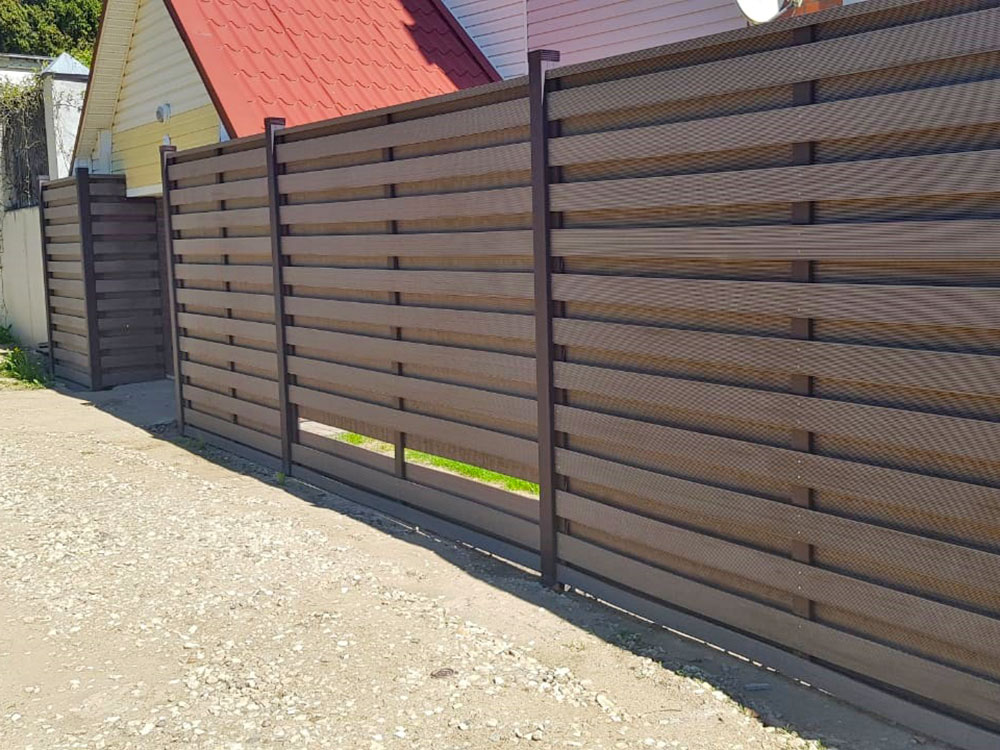 Эстетично выглядит с двух сторон и имеет хорошую вентиляцию, что благотворно скажется на растениях растущих в непосредственной близости к забору. А его глухая конструкция, надежно скроет вас от посторонних глаз.